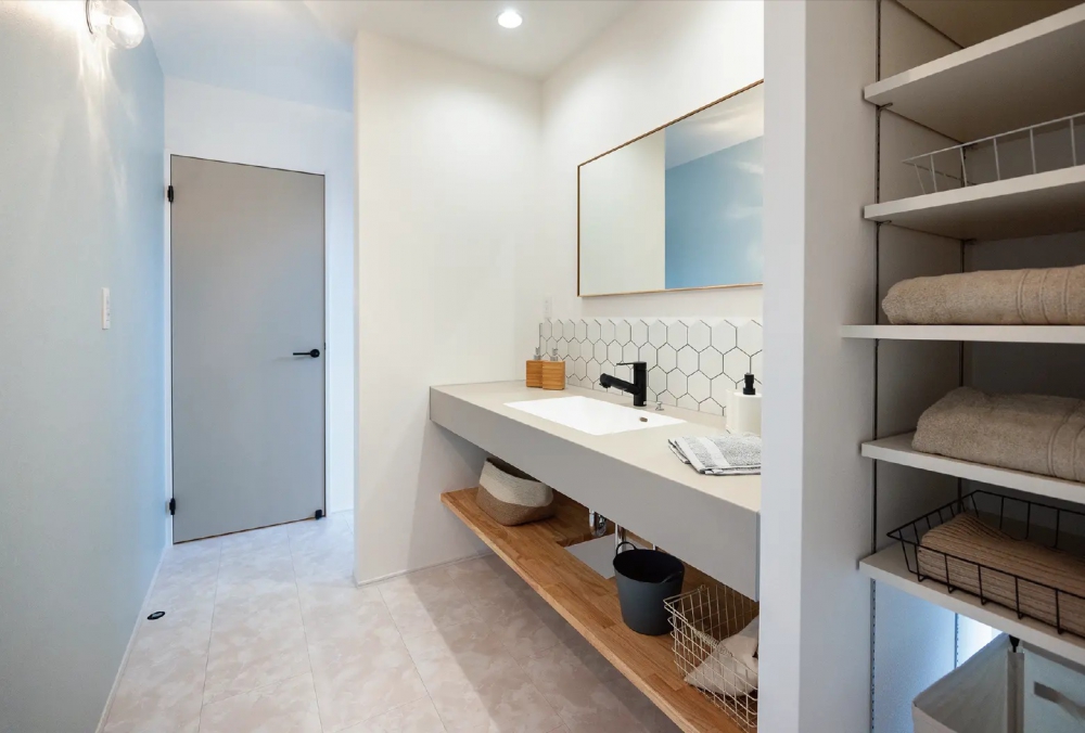 スペースを有効活用しながらもデザイン性を両立させた洗面室。収納スペースを洗面台の左右にしっかりと確保しています。