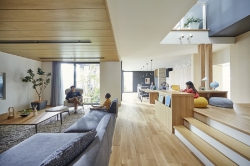 しなやかさと強靭さを合わせ持つH型鋼の柱と梁を、高層ビル建築にも用いられるハイテンションボルトで接合。設計の自由度とすぐれた耐震性能を両立させた構法です。また、250mmモジュールで敷地をフルに活用しつつ、1階~3階までの通し柱不要で各階自由なプランを可能にしました。