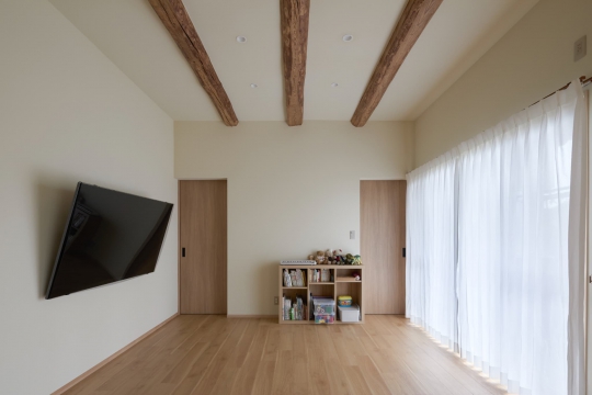 解体で現れた丸太梁を活かしたリビング。天井が上がり、空間に明るさと広がりが生まれました。