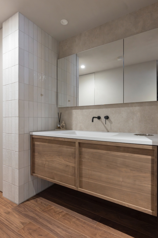 TVを観ながら家事ができるよう、リビング内に洗面台を設置。空調が行き届き、常に快適な環境で身支度が可能になりました。寝室からWIC、洗面台、脱衣室へとスムーズな動線を確保し、日々の使い勝手も向上。無垢のルーバーが温かみと統一感を生み出し、美しさと機能性が調和した空間が広がります。
