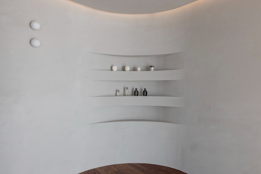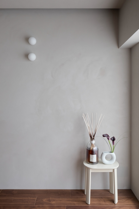 グレージュ・木・タイルを基調とした低彩度のコーディネートで、静けさと奥行きを感じられる住まい。塗装仕上げの柔らかなR壁が自然光や間接照明によって陰影を生み出し、部屋全体を優しく包み込むような雰囲気をつくり出しています。各所に設けた隠す収納で生活感を抑えつつ、素材や光の表情を心ゆくまで楽しめる空間です。