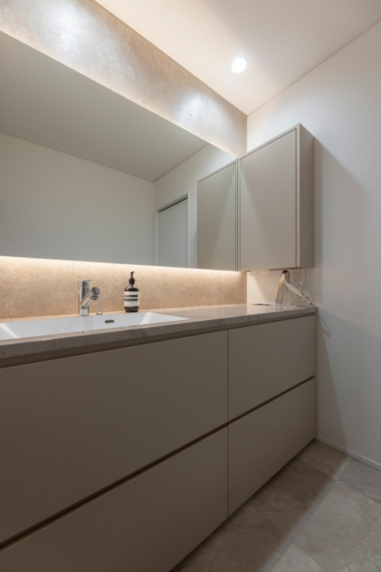 動線や収納計画を丁寧に整え、毎日の家事や掃除がしやすい住まいへ。ホテルライクな世界観と調和するリシェルのキッチンや高性能の住宅設備を取り入れ、暮らしの負担を軽減しました。玄関やトイレにはエコカラットを施すことで、空間にさりげないアクセントを加え、上質で安らぎに満ちた暮らしが広がります。