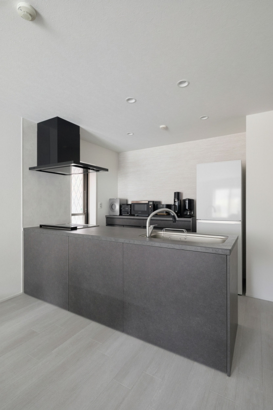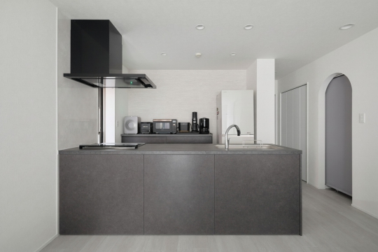 白×グレージュで統一感を出しつつもキッチンには濃い目のカラーを使用したことで、間延びしない広々としたLDKを実現しています。