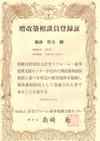 住宅建築の現場に10年以上携わっているベテランであり、財団法人住宅リフォーム・紛争処理支援センターが企画したカリキュラムの研修会に参加し、その考査に合格した者が増改築相談員として登録できます。