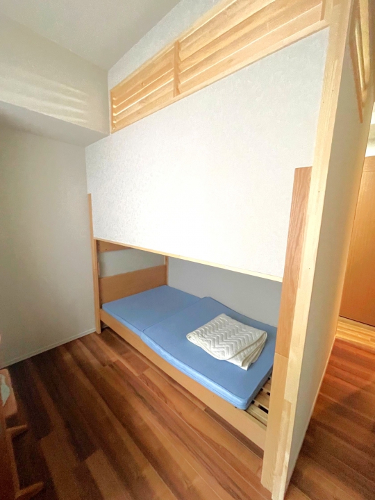 二部屋で交互に跨る二段ベッドの造作事例です。寝室の二段ベッドとして使いつつ、個室のプライベート空間が確保できるアイデアリフォームになります。ベッド一つ分のスペースが確保できるため、内装の自由度が上がります。