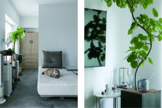 シンプルですっきりとした中に、お気に入りのインテリアグリーンが日常に溶け込むような空間を実現。