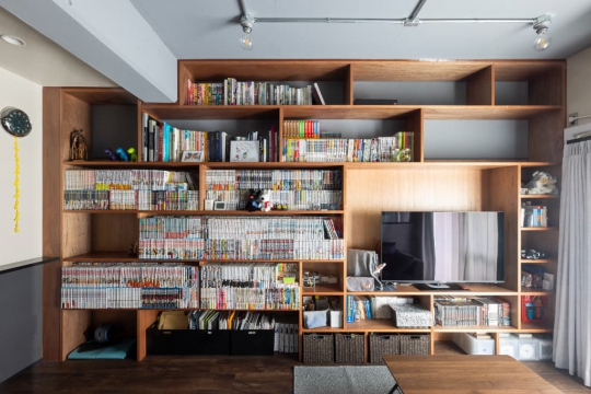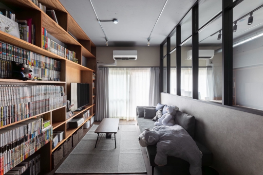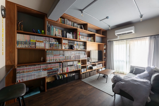 物件探しからワンストップで叶えたリノベーション。暮らしのテーマは「好きなものだけに囲まれて過ごすこと」。壁一面の造作本棚には大好きな漫画を収納。さらに、無骨な素材感のインダストリアルなインテリアに、自分らしい遊び心をプラスしました。家のどこにいてもお気に入りのアイテムを見渡せ、「ここが一番好きな場所」と言える特別な住まいが完成しました。