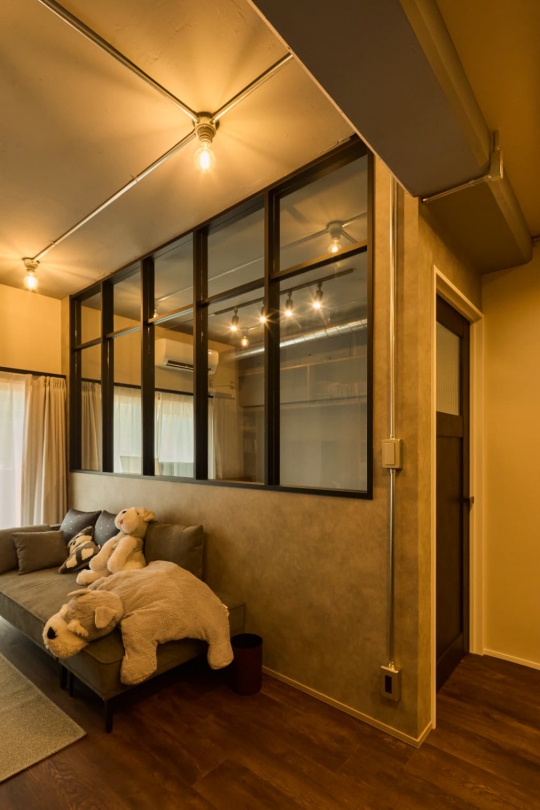築15年のマンションをリノベーションした施工事例。 1つ1つの素材の質感やインテリアまでこだわったLDKはインダストリアルな雰囲気に統一。天井を躯体現しにしたりキッチンの腰壁にモルタル調の内装材を用いました。インダストリアルな雰囲気の中にも木材の温かみのある優しい印象がどことなく心地よさを感じさせます。