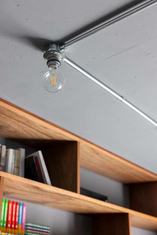 和室は完全に個室化せず、適度に視線が抜ける格子状の建具を造作して開放感を生み出しました。手持ちの檜のペンダントライトに合わせ、和室の式台や床板には檜の間伐材を使用しています。暖かい光と木の香りに包まれた、旅館のような心地よい空間で、第二の人生を新たにスタートさせました。