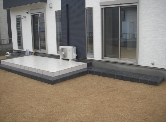家の外壁にマッチさせるため、玄関のタイルにはブラックのピンコロ石を大量に使いました。また、テラスも家の外壁に合わせてタイルの選択を行いバーベキューのできるオシャレなテラスになりました。