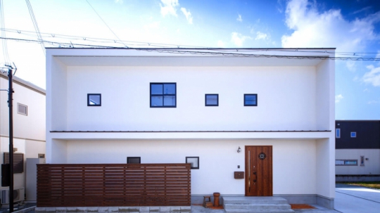 白い塗り壁の外壁と、広い土間玄関、シンプルオシャレな2階建ての家。