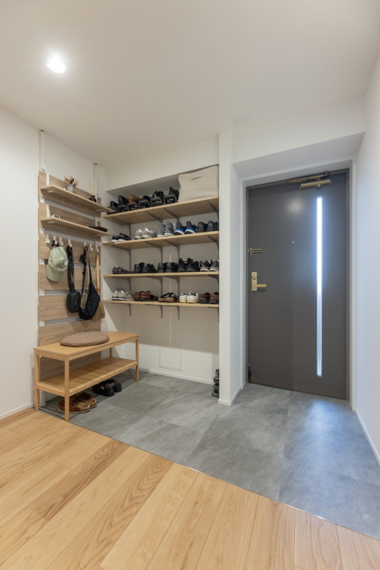 中古マンションを購入しスケルトンリノベーションを行った今回のお住まい。 お住まいの顔である玄関は、土間を設け既存の2倍以上のスペースを確保しました。 オリジナルの玄関収納と有孔ボードを設置し、デザイン性・収納力ともに申し分ないつくりになっており、寝室に繋がる内窓は玄関に光の温かさと開放感をプラスしています。 お住まいの随所に趣のある、どこかレトロな雰囲気を感じる仕上がりのお住まいが完成しました。