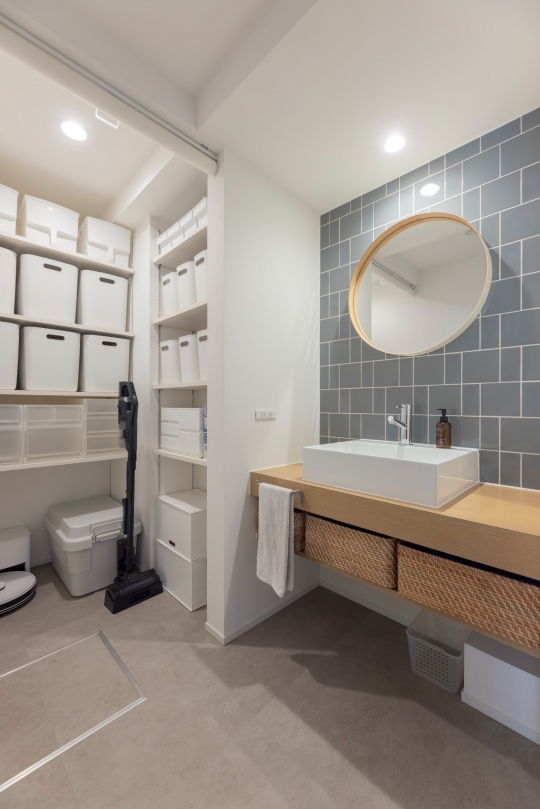 柔らかく優しい色合いのなかにブルーの差し色が映えて、北欧カフェにいるようなホッと安らげる空間。ゆとりある広さが確保された小上がり畳は恰好のくつろぎの場で、収納スペースや来客時の寝室などマルチに使える実用性も兼ね備えています。