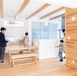 <家族の気配がいつも感じられる吹き抜けリビングの家>