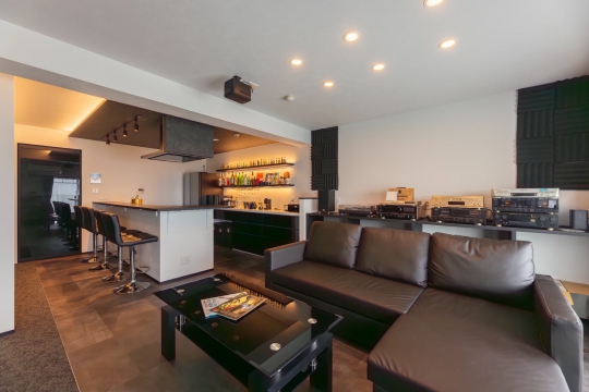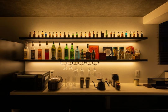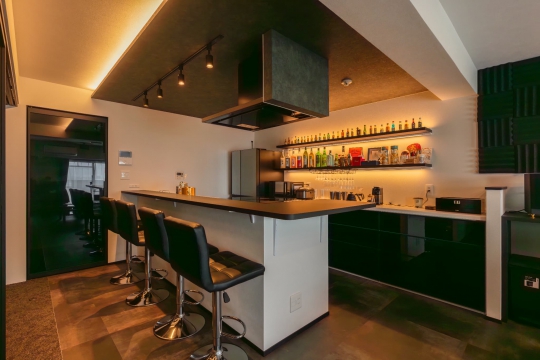 オシャレなバーの雰囲気を出したいという施主様のご希望に合わせて、全体的にシックで落ち着いた雰囲気に。キッチン背面に飾り棚と間接照明を取り入れることでよりお酒の映える演出を行いました。スキップフロアや隠し扉を計画し、遊び心満載の空間に仕上げています。