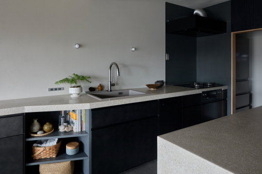 自分にとっての心地よさを見つめ直し、辿り着いたのは完璧に整えすぎない余白のある暮らし。整えるよりも生かすことを大切に、扉をなくした開放感や玄関を通る離れのような書斎など、日常のゆらぎやオンオフの切り替えを「間」の設計によって表現しています。素材のムラや経年変化を肯定する民藝の思想のように、新しいのにどこか懐かしく、住むほどに自分に馴染んでいく唯一無二の住まいです。