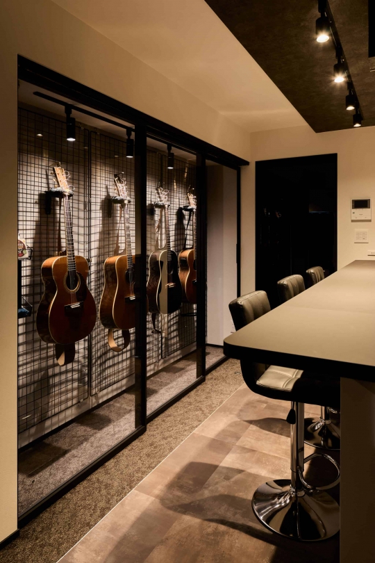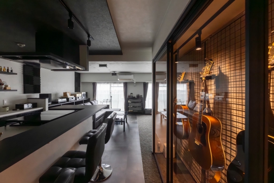 現役を引退し、趣味を存分に楽しむための住まいへリノベーション。壁面に設けたディスプレイスペースは、まるでギャラリーのようにお気に入りのギターを並べられるこだわりの場所に。空間の一角にはバーのような雰囲気を取り入れ、大人だけのくつろぎ時間を演出しました。音響にもこだわり、趣味を中心に据えた上質な空間を実現しています。