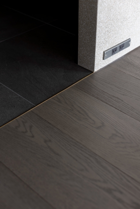 メインの床材にはデザイン性のある無垢材を使い、無骨ながらも程よいくつろぎを感じられる空間デザインに。まるで昔の学校のような懐かしさもありながら無垢独特の柔らかい雰囲気が住まいの温かさを演出しました。