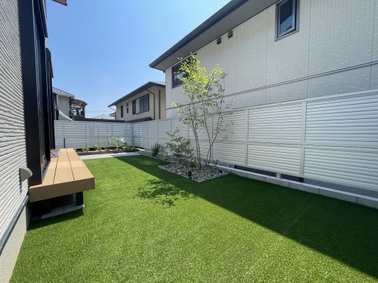 プライベート空間を充実させていただいた事例になります。家の中からも植栽が見えるように工夫させていただきました。エクステリアの使い方次第ですごく広く満足のいくお庭になります。