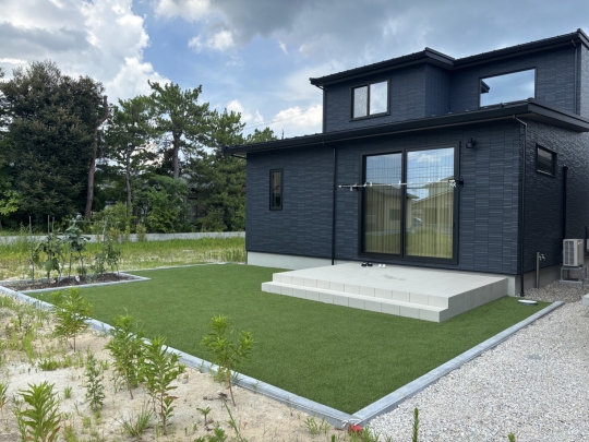 土間コンクリート、カーポート、砂利敷き、人工芝、タイルデッキ