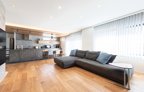 築20年のマンションにお住まいのSさま。ライフスタイルの変化をきっかけに間取りやデザインを一新したいとご相談をいただきました。希望されたのは木の質感が感じられるお住まい。和室を取り込み広がりを持たせたLDKは、和の趣きを感じる上質な空間に。床材や格子の扉、付け柱にこだわり、理想とされていた日本建築の落ち着きを演出。洋室の一部を納戸として活用し、収納力も確保。心地よく過ごせるお住まいとなりました。
