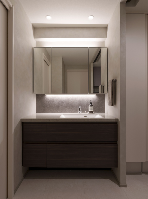 【洗面室】淡いグレーやベージュのカラーリングで、上品に仕上げた洗面室
