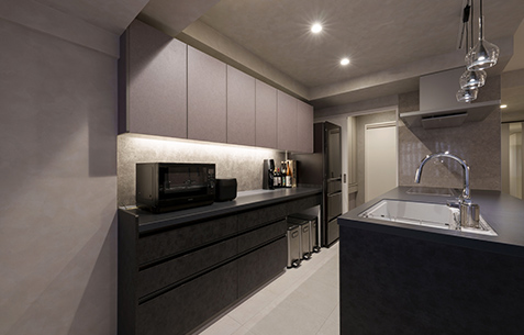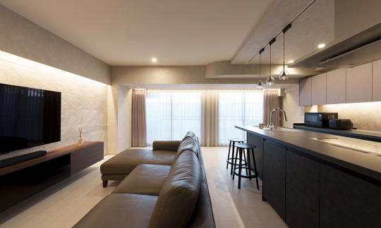 築26年のマンションにお住まいのSさま。お子様の成長や在宅ワークの開始など、暮らしの変化に合わせた、間取りの変更をご希望でした。書斎や可変性のある子ども部屋を設け、キッチンはオープンキッチンに一新し、開放的なLDKを実現。内装は、グレージュ・ダークグレーを基調に、タイルや間接照明を取り入れラグジュアリーな空間へ。水まわりもデザインと機能性を両立した設備を採用し、ホテルライクなお住まいになりました。