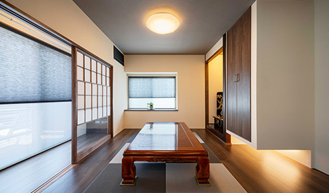 【和室】あまり使っていなかった玄関ホールは、和室に変更。仏壇も格納 できる収納棚を設けて、スッキリと