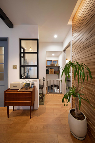 【玄関】Iさんに馴染みのある京都町家をイメージし、土間スペースを提案。キャットステップも造作し、愛猫も楽しめる場所に