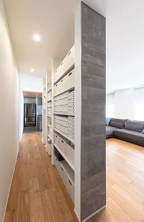 【リビング】リビングの壁一面には、収納棚を造作。棚の高さを調整できるので、しまうモノの大きさに合わせて、スッキリと片付けられる