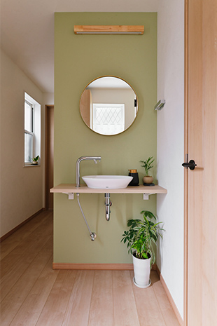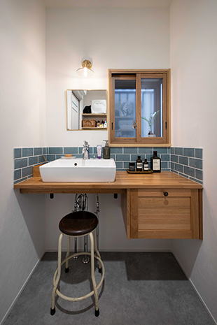 【洗面所・脱衣所】木目の洗面カウンター+グリーンのタイルを組み合わせカジュアルな雰囲気を演出。さらに、ミラーと照明を取り付けてオシャレな印象に仕上がっています