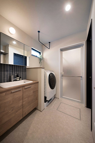 【洗面所・脱衣所】洗面室は玄関のそばに配置。帰宅後すぐに手が洗えて 便利。いつでも洗濯できるランドリースペースとしても使える