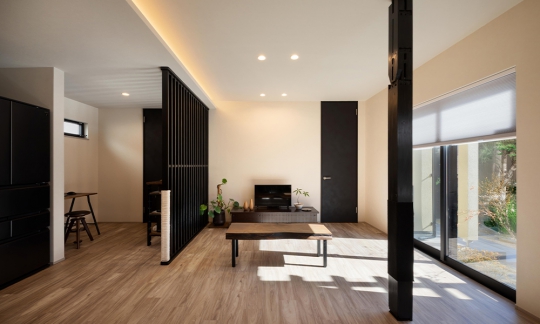 中古住宅を購入されたYさま。2階部分を取り払い、平屋にするリフォームを決意されました。間取りはLDKをメインにキッチンから水まわり、書斎、洋室、玄関とフロア全体を回遊できる動線を実現。造作の格子壁や、既存の柱を塗装し、 全体をアースカラーでまとめたことで、和の雰囲気を演出。さらに間接照明が洗練された空間を創出しています。また、ペットとの暮らしに備え、お掃除しやすく滑りにくいフロアタイルを採用。
