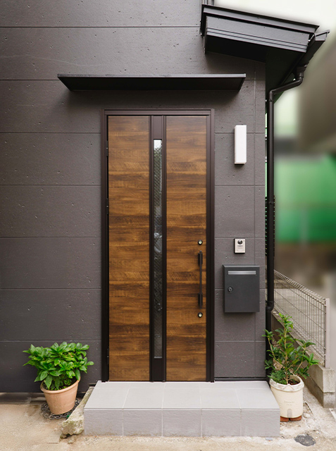 【外観】シックな色合いの外壁材に貼り替えて美しく一新。玄関を減築したことでポーチが生まれ、落ち着いた雰囲気に