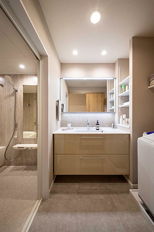 【脱衣室・浴室】壁一面に大容量の収納棚を設置。ランドリースペースとしても活躍