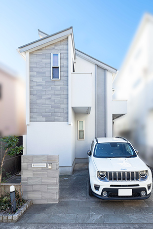 【外観】外壁は白で塗装し、グレーのサイディングを組み合わせて シックで落ち着いた雰囲気に。屋根もふき替えて新築同様に再生