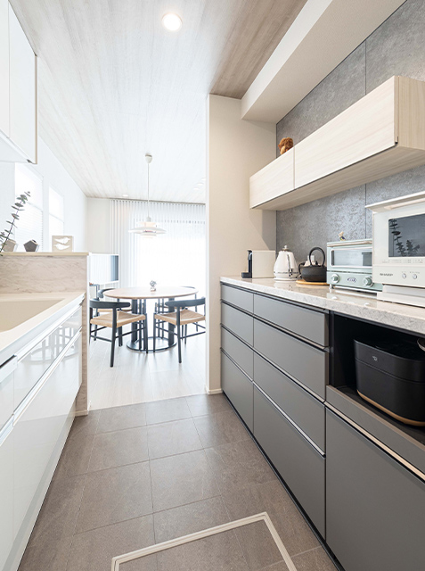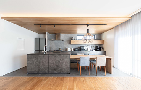 【キッチン・システムキッチン】グレーや木目を組み合わせて落ち着いた雰囲気に。LDKとキッチンの天井を同じデザインにすることで、広く伸びやかな空間を演出しています
