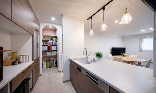 【キッチン】作業のしやすさを重視し、調理や盛り付けがスムーズに行えるゆとりあるスペースを確保。キッチン横にはパントリーを設け、入り口をアーチ型にすることで、程よいアクセントをプラスしました
