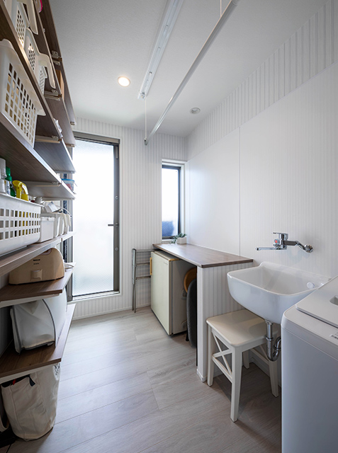 【ランドリールーム】ランドリールームは1階から2階へ移動。新設したバルコニーに隣接させることで、スムーズな洗濯動線を実現しています。シンクやカウンターも設置し、作業が完結できるスペースに