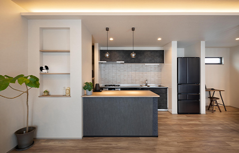 【キッチン・システムキッチン】LD全体を見渡せる対面キッチン。飾り棚の裏側にパントリーと家電置き場を設け、LD側から見えないようにプランニング。天井の間接照明が、高級感のある雰囲気を演出しています
