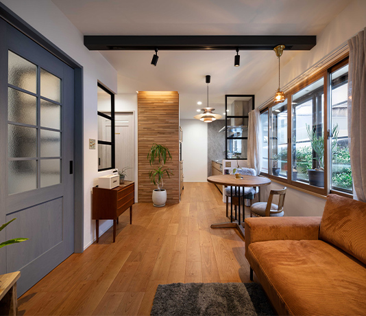 築32年が経ち、内装の傷みや室内の寒さが気になりリフォームを考え始めたKさま。カフェ風の内装デザインや、間取りの変更をご希望でした。完成したのは、ヴィンテージ風カフェスタイルのお住まい。ブルーグレーの建具ドアやブラックの室内窓がアクセントとなり、オシャレな雰囲気を演出。また、L字型のキッチンはLDKと平行に配置。さらに、断熱工事と内窓を取り付けたことにより、暖かなお住まいへと生まれ変わりました。