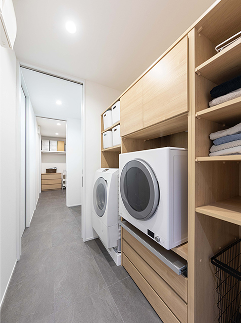 【ファミリークロゼット】LDKに隣接する水まわりは、ファミリークロゼット、洗面室、脱衣室を一直線につなげ、家事を効率的に行える動線を実現