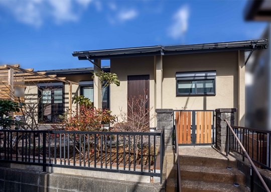 【外壁外装・屋根】2階を減築して平屋へとまるごとリフォーム。外観は和モダンの雰囲気に仕上げています。標準仕様に含まれる「制震+補強」の耐震工事を施し、永く安心して暮らせるお住まいへ