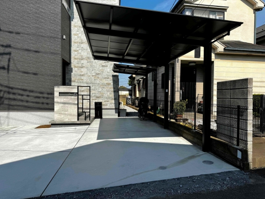 カーポート、門柱、フェンス、門は同じ木彫色で施工させていただきました。