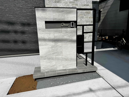 門柱は300×600タイルを貼り、床はコンクリート金鏝仕上げで施工させていただきました。