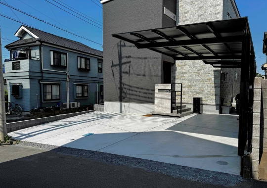 シャッター手前はコンクリート洗い出し、カーポート下はコンクリート金鏝仕上げ、お庭はドライテック、人工芝を施工させていただきました。