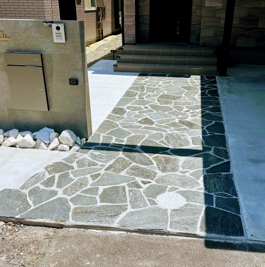 アプローチは乱形天然石 門塀は大きめのタイル 埋め込み式の宅配BOX カーポートの梁延長タイプでポリカは新色のブラックポリカです