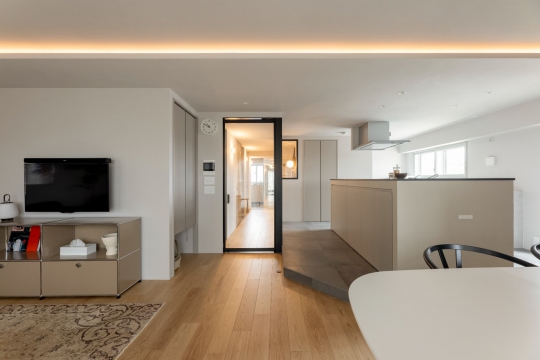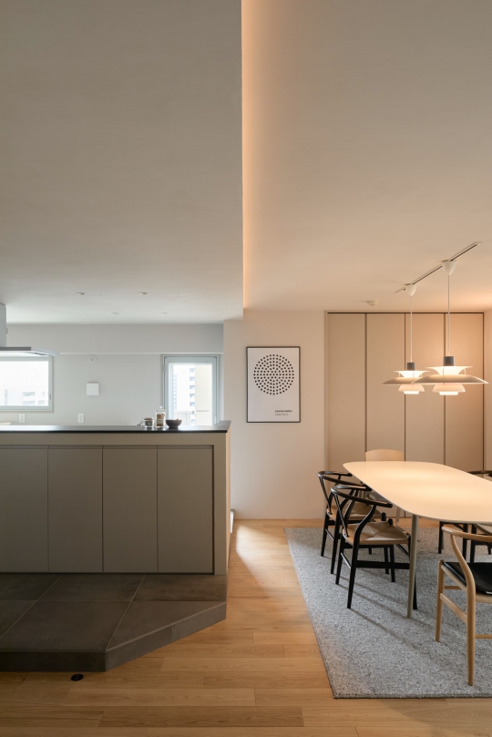 広々としたLDKとマンション最上階の勾配天井を活かし、豊富な収納を備えた空間へとリノベーション。リビングにはお気に入りの家具やインテリアを飾り、穏やかな時間が流れる居心地良いお住まいとなりました。R壁の曲線美が、モダン×ホテルライクな雰囲気を引き立てています。