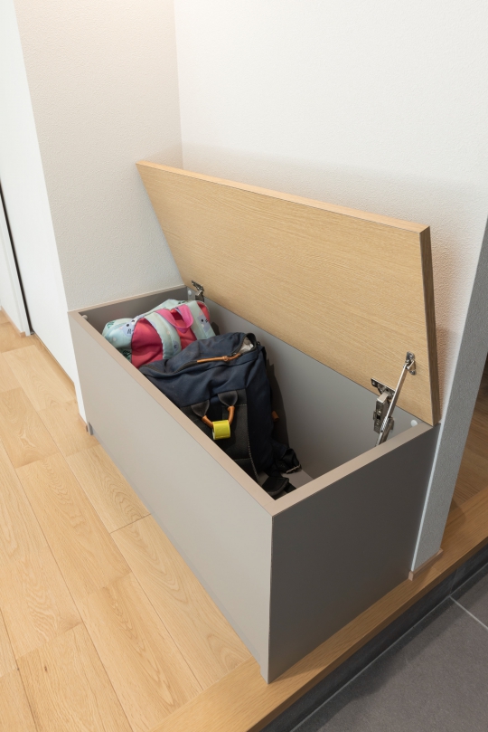 造作ベンチには身支度セットを収納でき、外出前の準備が整えやすくなりました。
