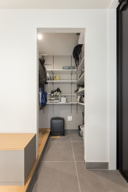 ご夫婦共通の趣味であるアウトドアグッズをまとめて置ける土間収納。見えにくい位置に靴棚をつくることで、生活感を隠してくれます。